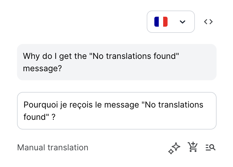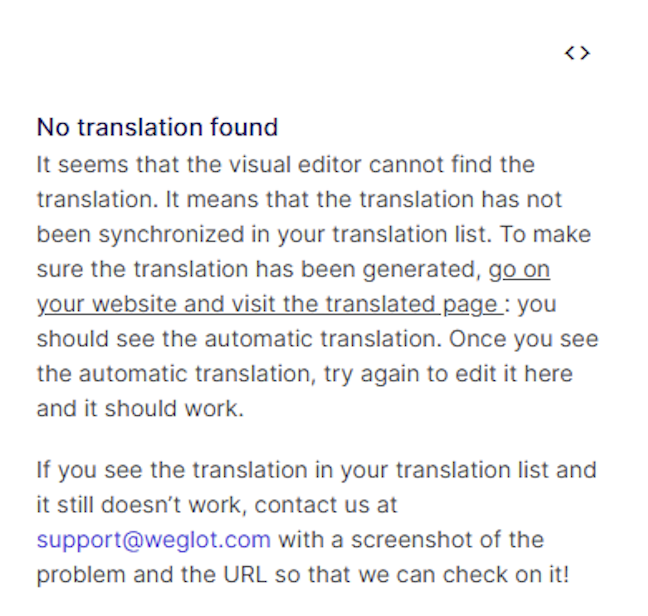 If you see the error message "No translations found" on the Visual Editor, it either means that Weglot hasn't translated the content yet, or that the translation exists but cannot be retrieved from your Weglot Dashboard > Translations > Languages > Translation List: