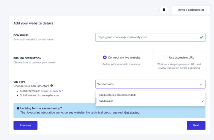 After clicking on "Next", add your domain name, and select the URL type you want.