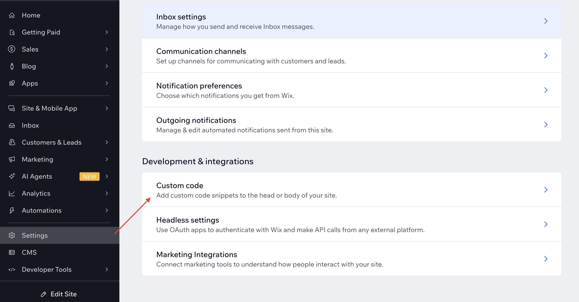 - Gehen Sie zu Ihrem Wix-Dashboard > Einstellungen. Scrollen Sie zu Entwicklung & Integrationen > Benutzerdefinierter Code.