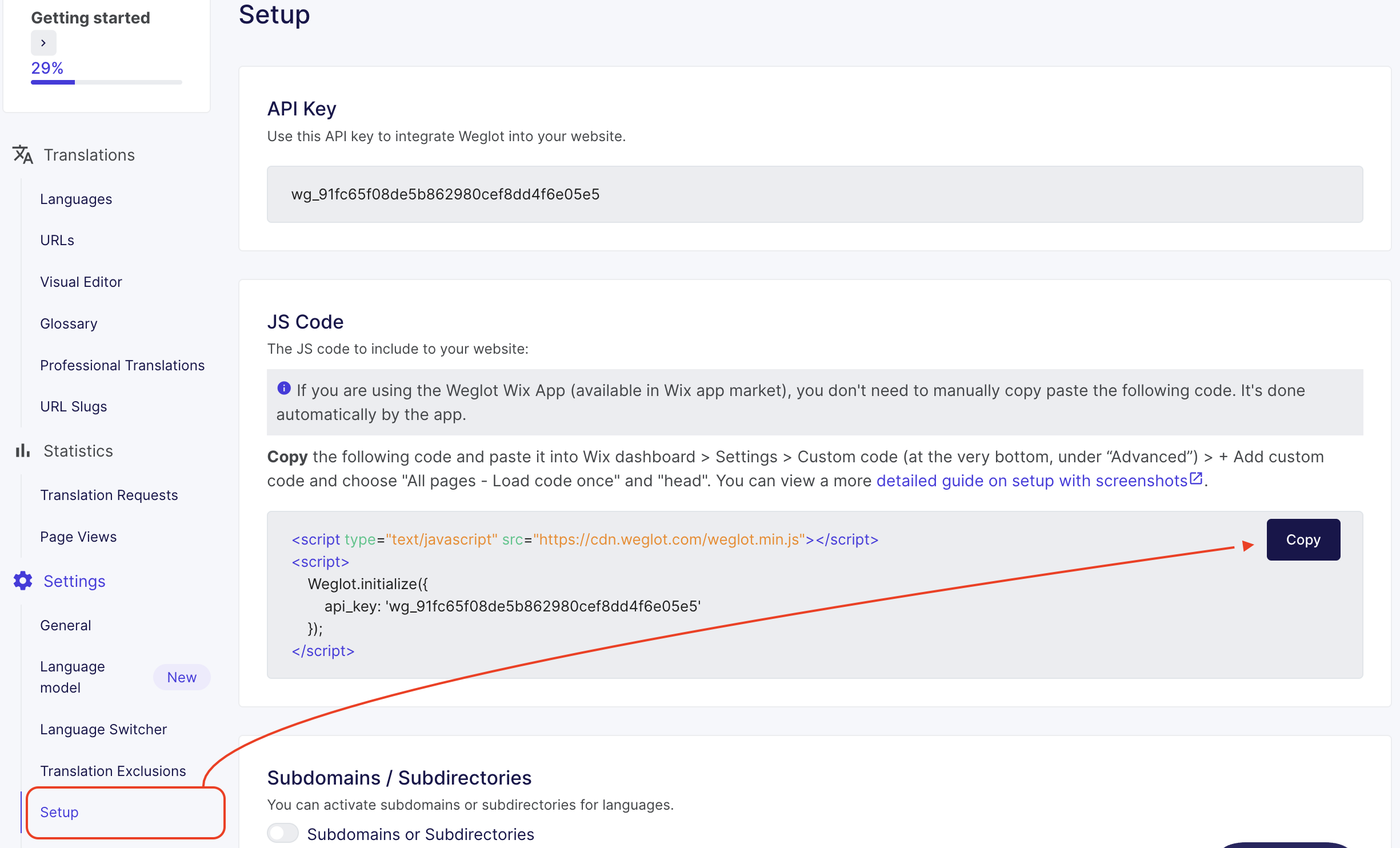 - Gehen Sie zu Ihrem Weglot-Dashboard> Einstellungen > Einrichtung und kopieren Sie den JavaScript-Codeausschnitt.