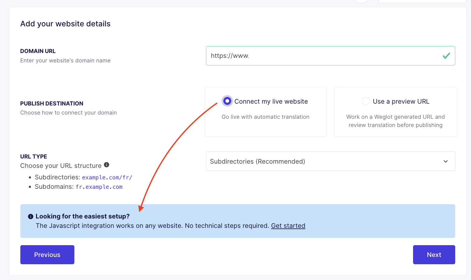 Sie sehen dann einen blauen Abschnitt mit der Überschrift "Suchen Sie nach der einfachsten Einrichtung? " - das ist die JavaScript-Integrationsoption.