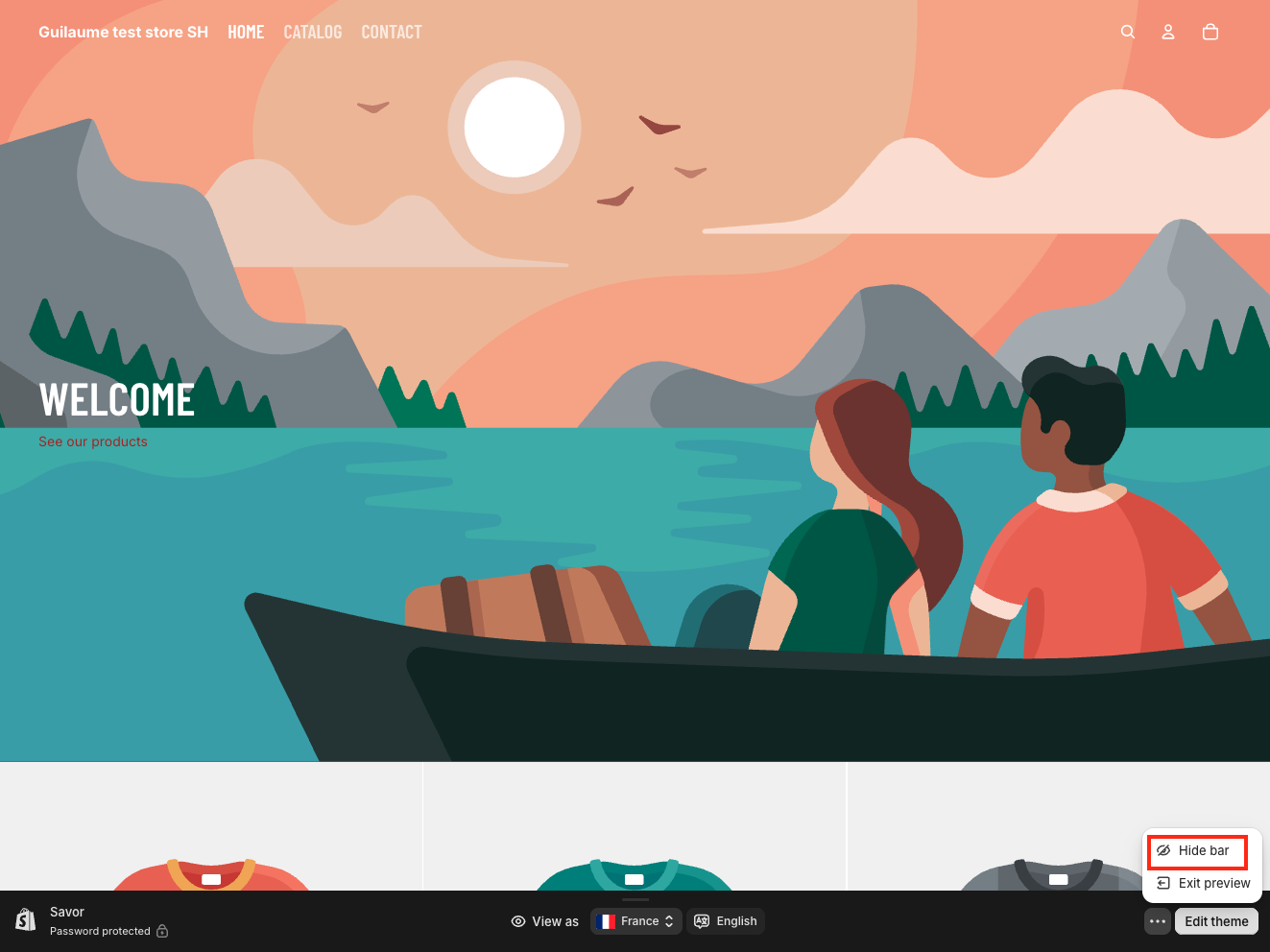La posición predeterminada del selector de idioma de Weglot es la parte inferior derecha de su sitio web (puede consultar la primera captura de pantalla de este artículo como referencia). Ahí es también donde se encuentra la barra de vista previa de Shopify, por lo que el selector de idioma predeterminado queda oculto detrás de la barra de Shopify. Puede ocultar fácilmente la barra de Shopify haciendo clic en «...» y «Ocultar barra».