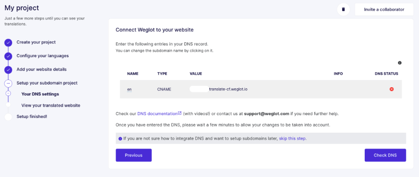 Une fois que vous avez ajouté et sauvegardé les entrées, retournez à la page Weglot. Vous pouvez cliquer sur "Check DNS" et une icône de verte devrait apparaître : cela signifie que tout a été configuré avec succès (cela peut parfois prendre quelques minutes ou même 10, donc ne vous inquiétez pas si l'icône de verte n'est pas encore apparue à côté de votre enregistrement DNS). Cliquez sur "Next".