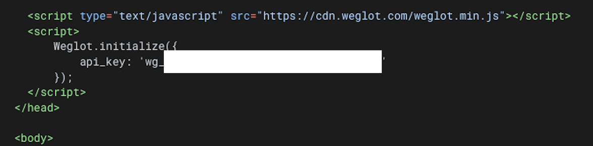 <script type="text/javascript" src="https://cdn.weglot.com/weglot.min.js"></script> <script> Weglot.initialize({ api_key: 'Your API Key' }); </script>”