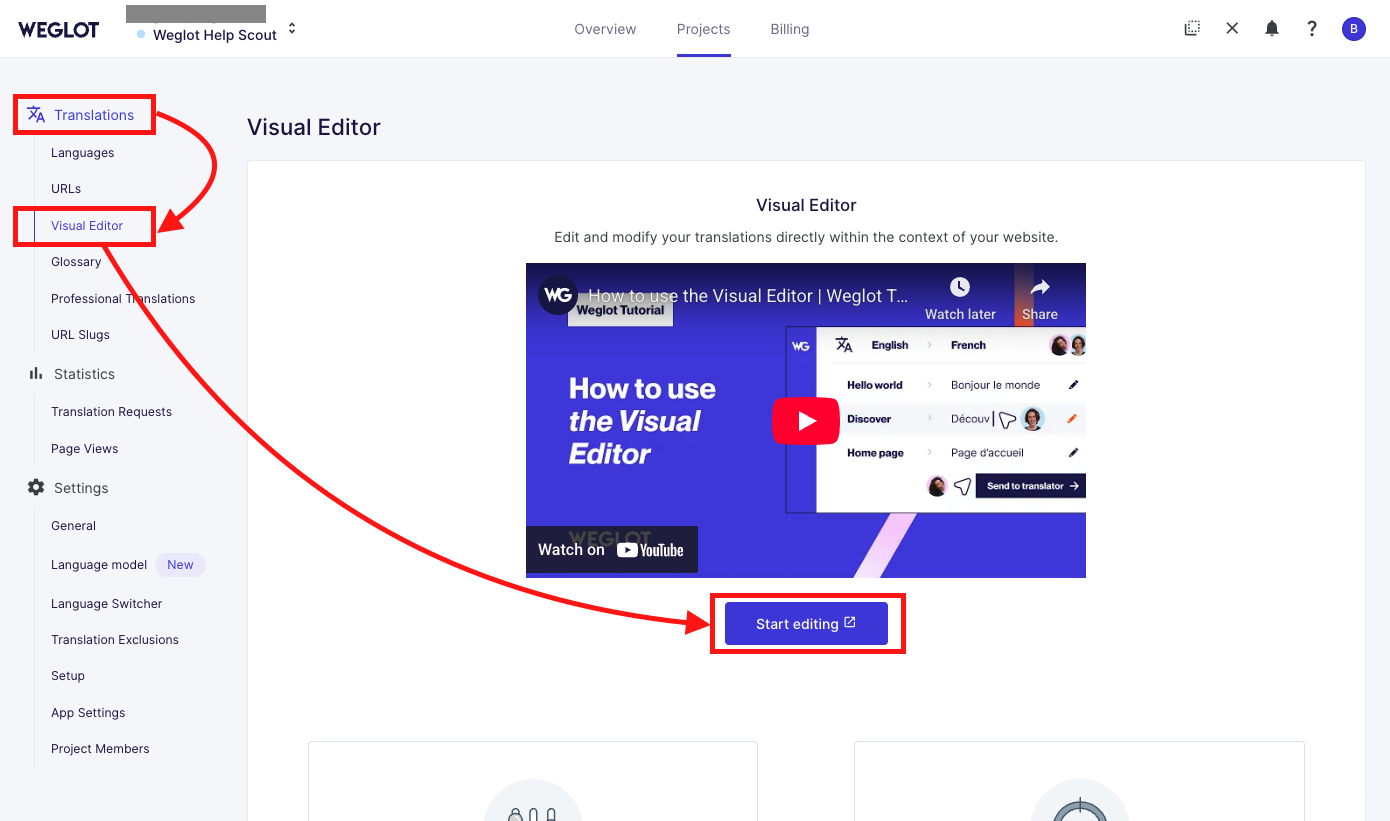 - Per accedere Visual Editor, vai alla tua Dashboard di Weglot > Visual Editor.