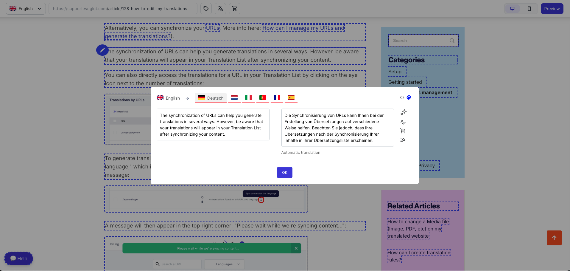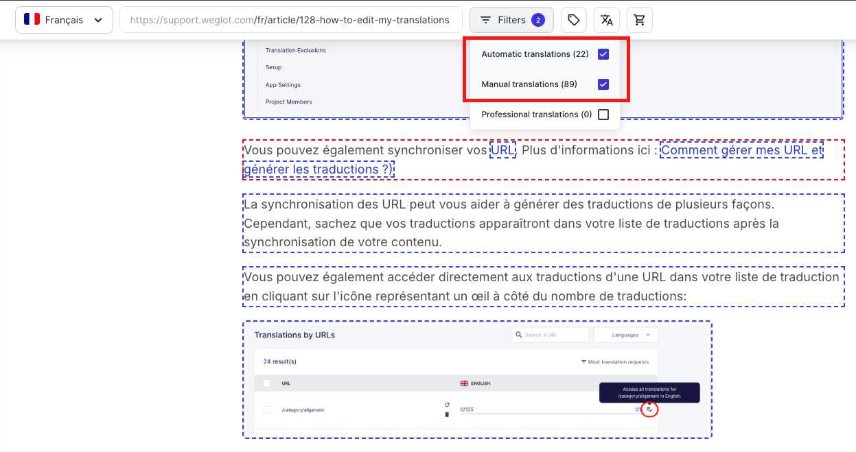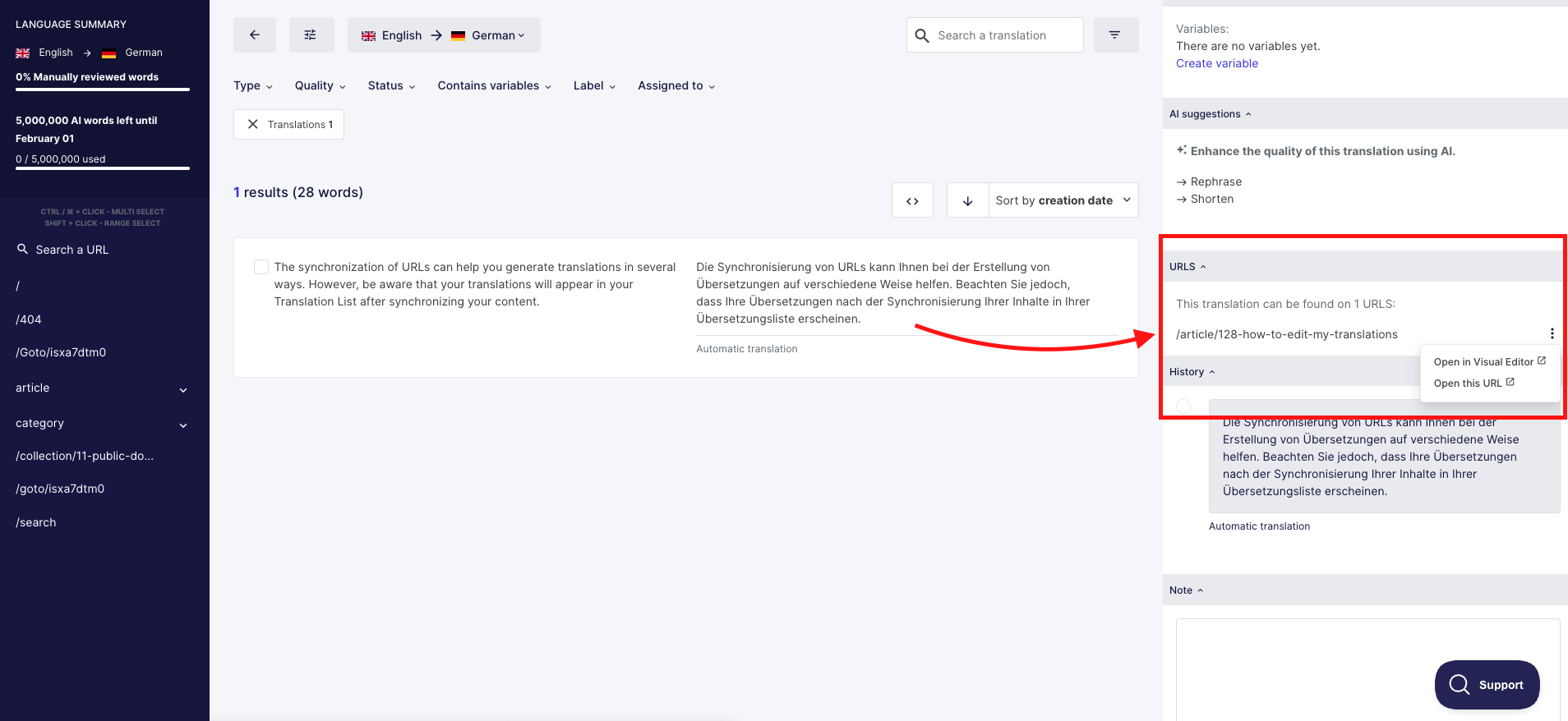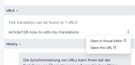 Si aprirà un pannello sul lato destro. Nella sezione URL troverai un link che ti reindirizzerà direttamente alla traduzione Visual Editor. Questo ti consentirà di modificare la traduzione nel contesto della pagina pertinente senza dover navigare manualmente nel sito.