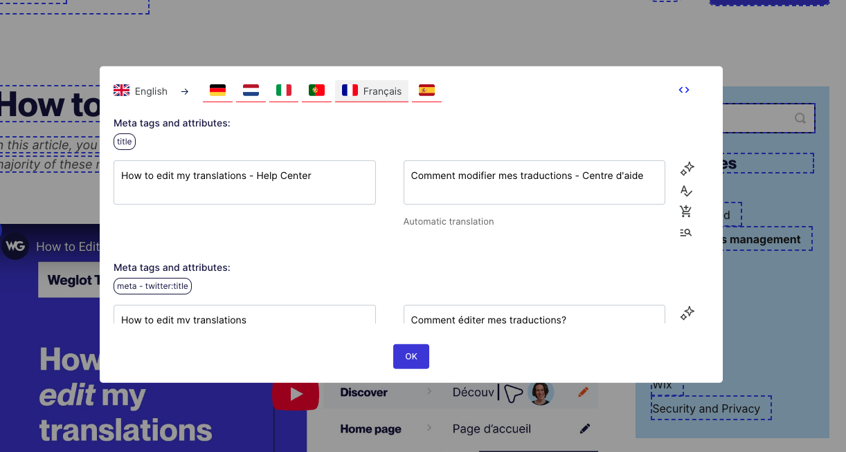 Si aprirà un pannello che mostra i meta tag disponibili per la pagina corrente. È possibile modificarli utilizzando lo stesso flusso di lavoro delle traduzioni di testo standard. Una volta completata l'operazione, le modifiche verranno applicate alla versione tradotta della pagina.