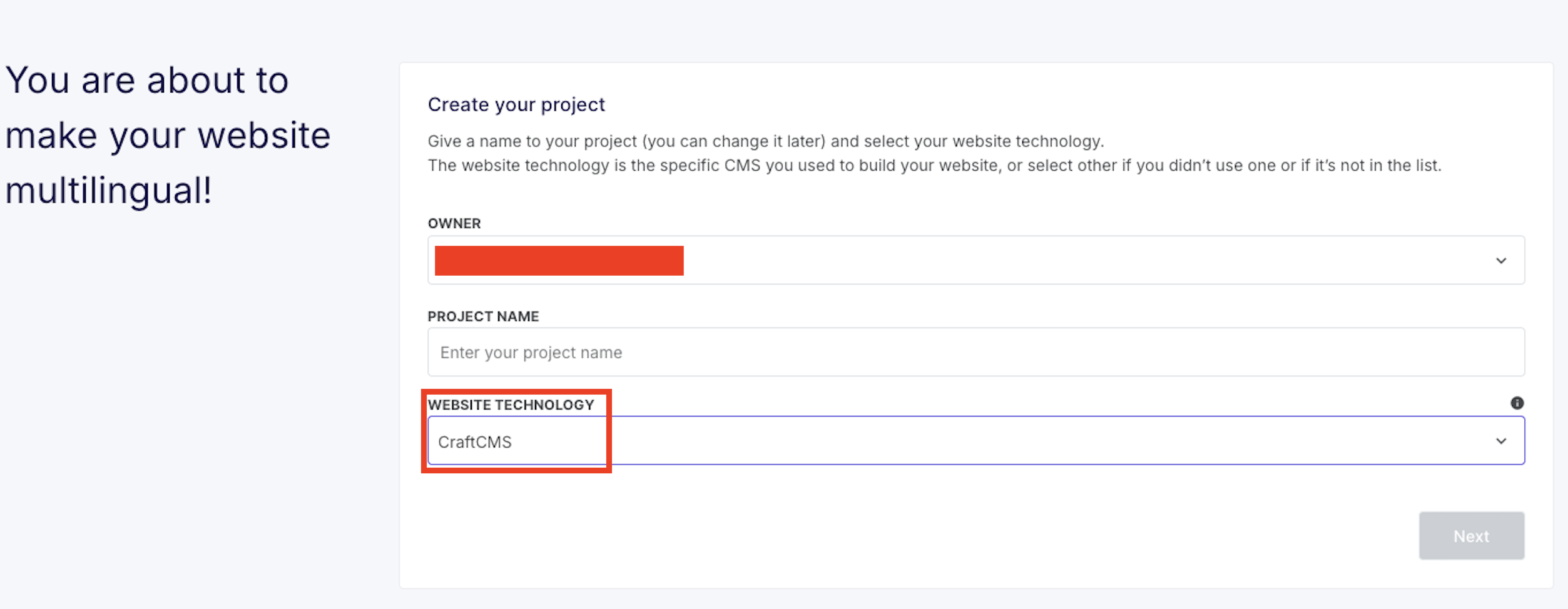 Una volta confermato il vostro indirizzo e-mail, avrete la possibilità di creare il vostro primo progetto Weglot.
