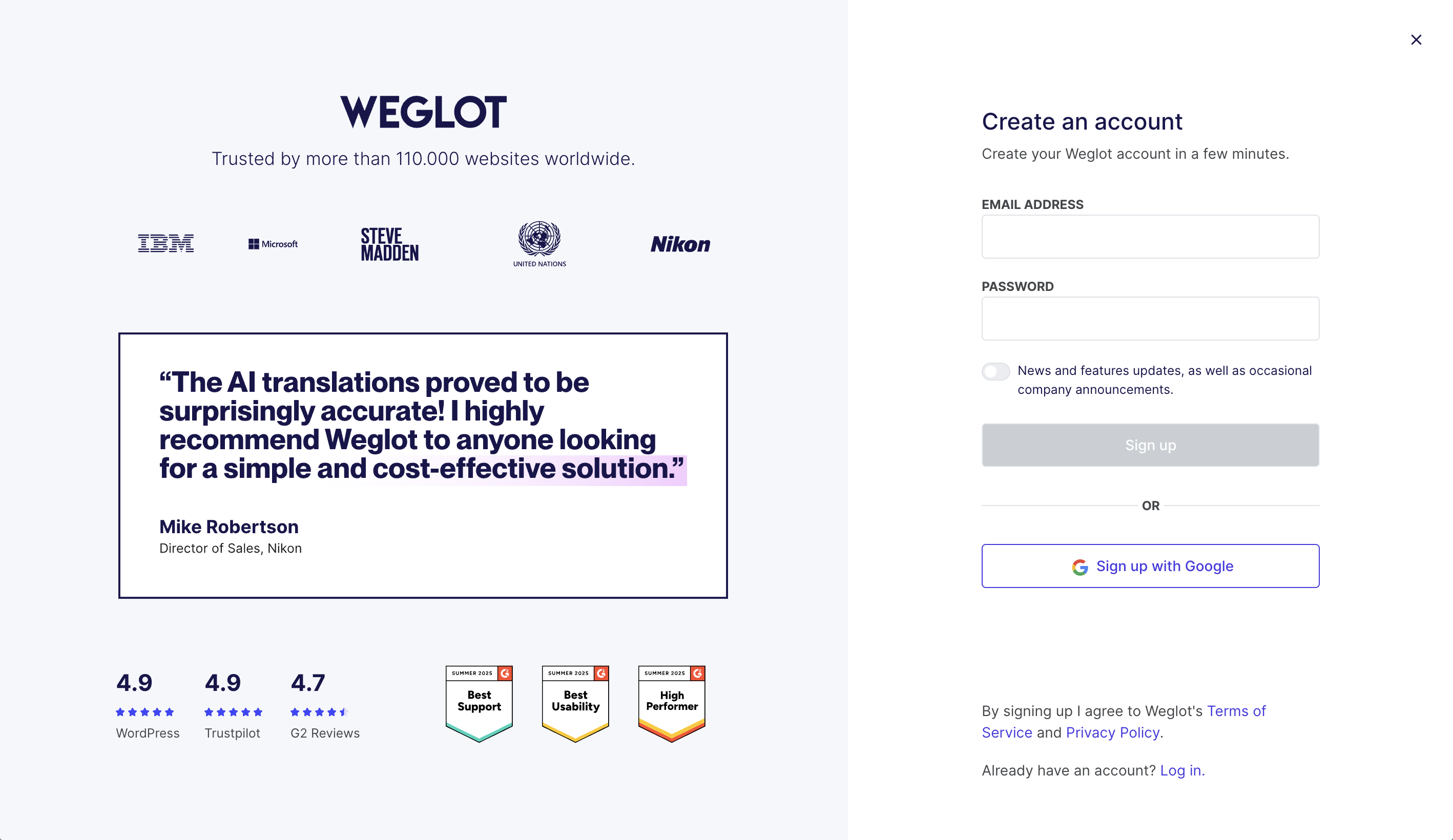 Ga naar https://dashboard.weglot.com/register en maak je account aan met je e-mailadres en wachtwoord.