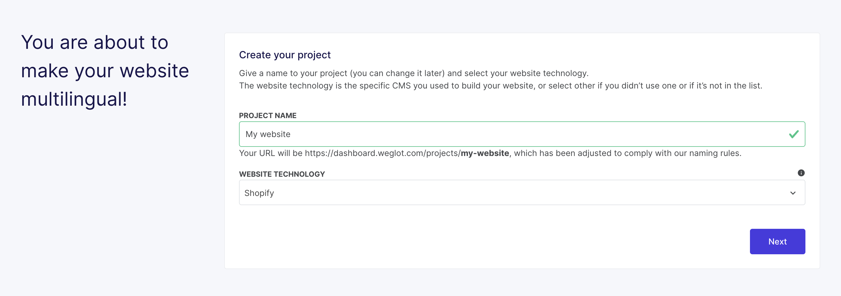 Voer een naam in voor je project (bijvoorbeeld de naam van je website) en kies Shopify als technologie.