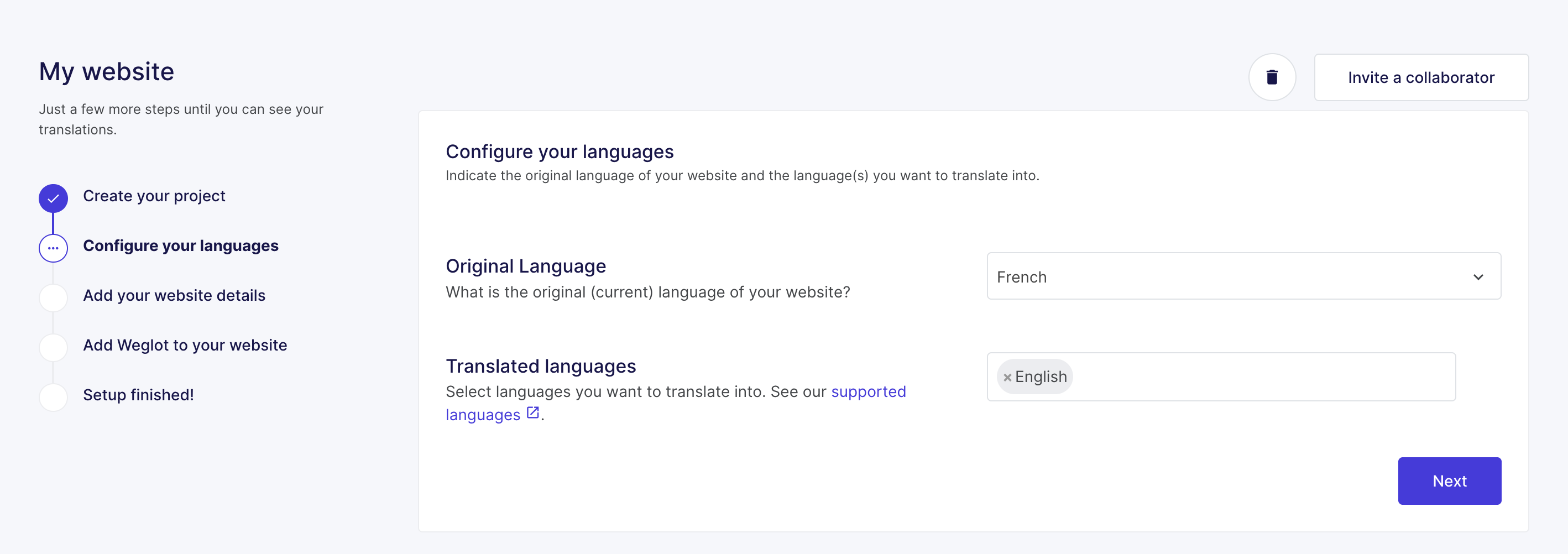 Selecteer de taal van je originele website en de talen waarin je je website wilt vertalen.