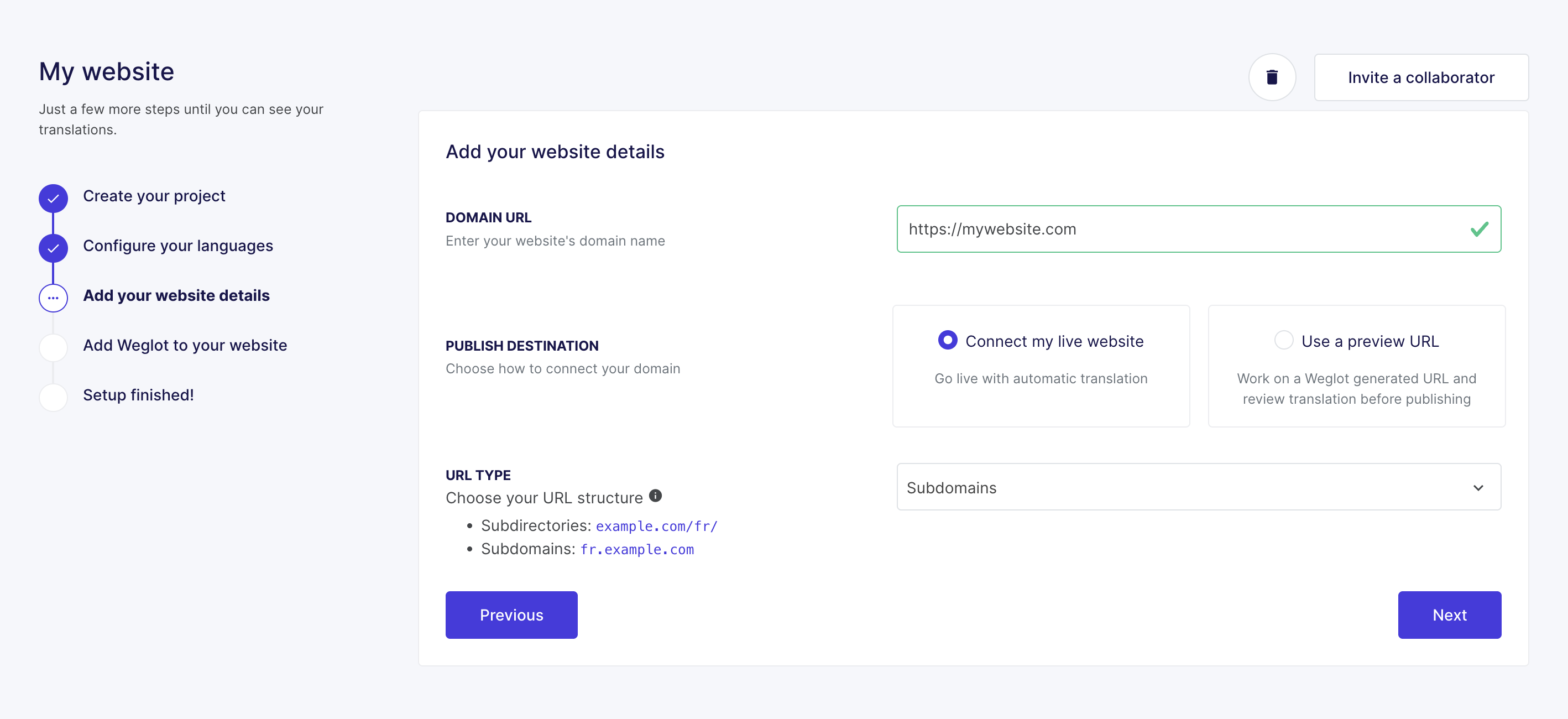 ⚠️ Opmerking: Weglot beheert de DNS propagatietijd niet. De subdomein-gebaseerde integratie configuratie kan tot 24 uur duren, hoewel het meestal veel minder is. Gedurende deze tijd kunnen de vertaalde versies van uw website niet beschikbaar zijn.