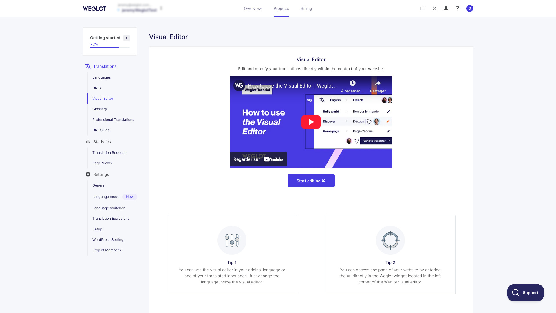 U kunt de Visual Editor openen Visual Editor uw Weglot-dashboard > Projecten > Visual Editor. Om de Visual Editor gebruiken, moet uw website online en openbaar toegankelijk zijn.