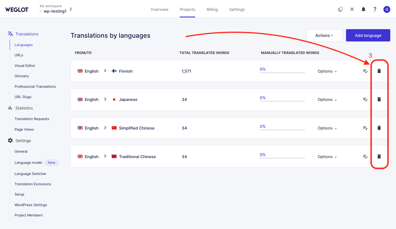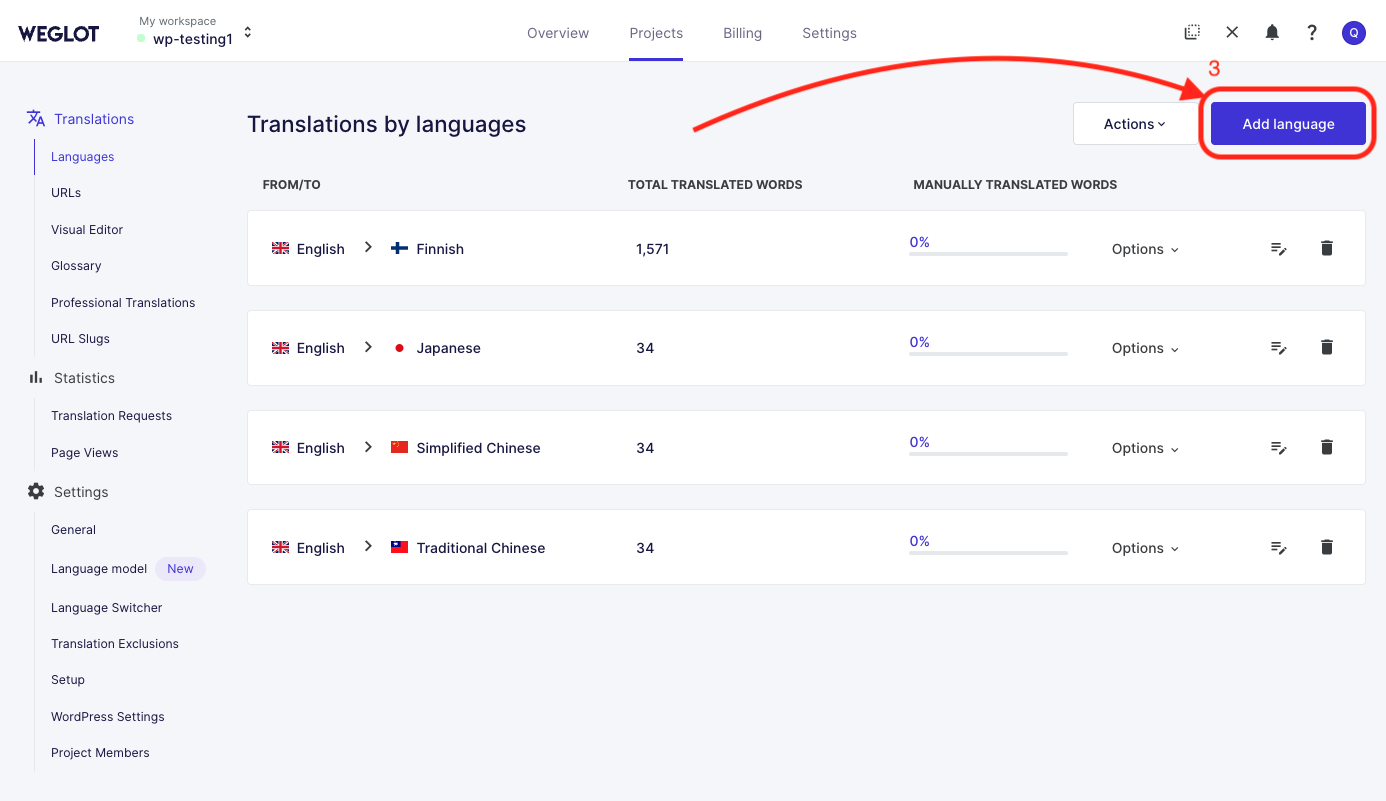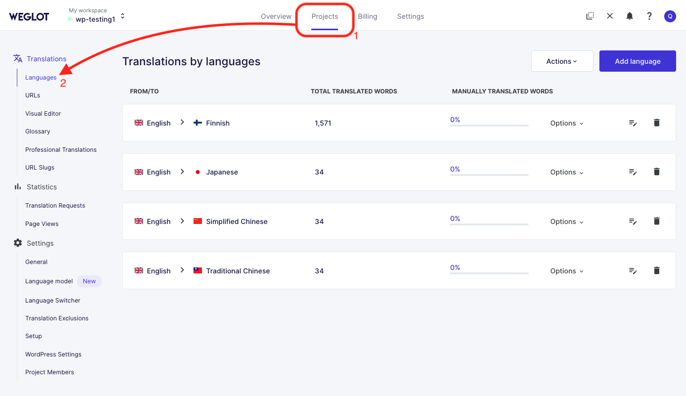 1) Ga naar je Weglot-dashboard, open het tabblad "Projecten" en ga naar het gedeelte "Vertalingen" > "Talen".