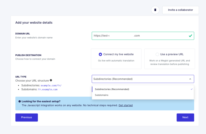 Als je problemen hebt met het instellen van de subdirectory, kun je contact met ons opnemen via support@weglot.com.