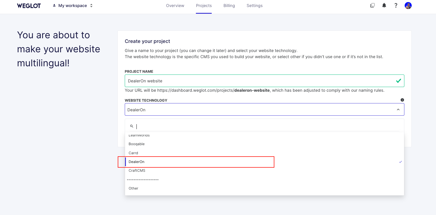 Inscreva-se no Weglot, confirme o seu e-mail, dê um nome ao seu projeto no painel de controlo e selecione "DealerOn" como tecnologia do sítio Web.