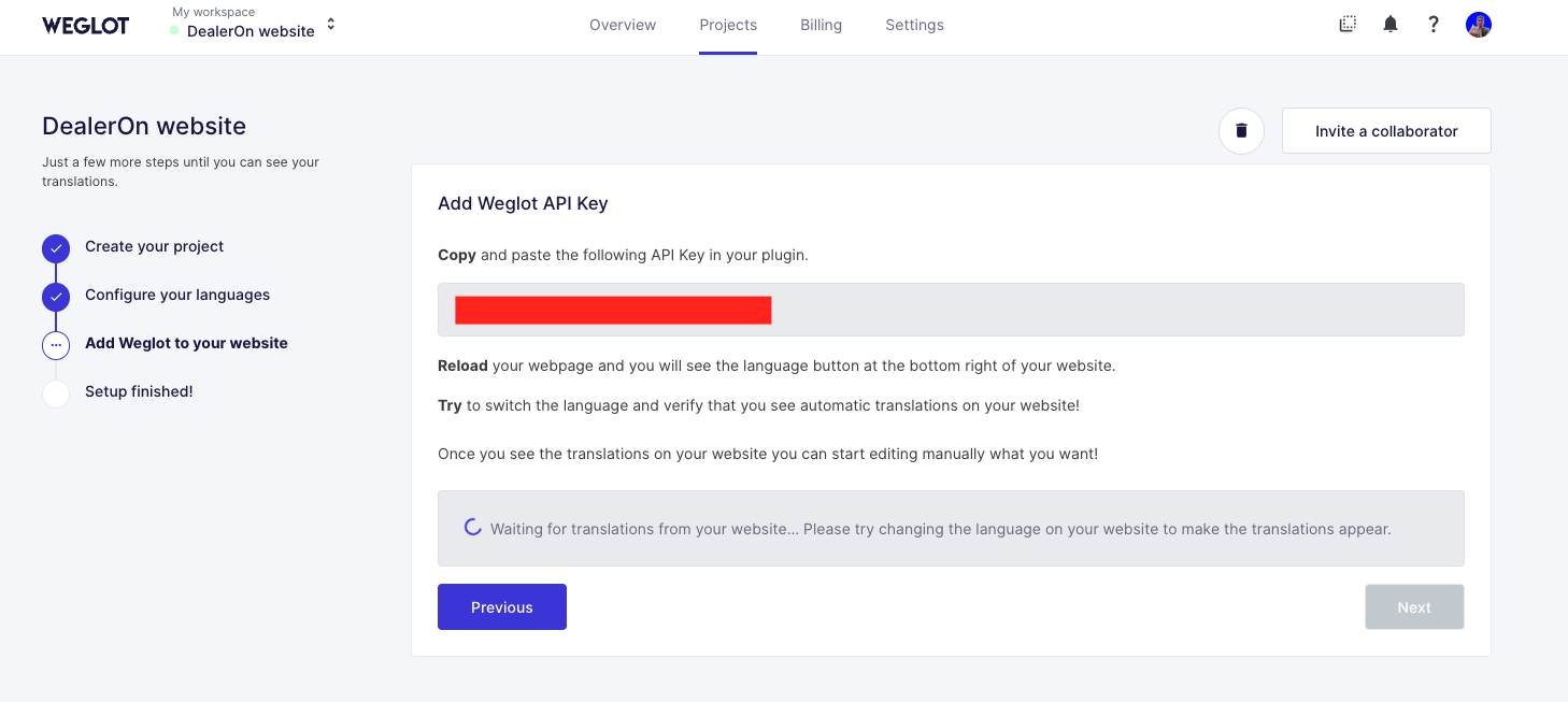 Copie a chave API da Weglot fornecida no seu painel de controlo e cole-a na DealerOn.